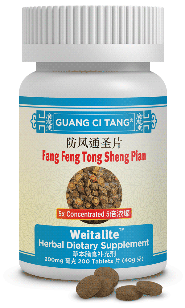 Fang Feng Tong Sheng San (Pian) is a well respected Chinese herbal medicine formulated over 800 years ago. In Traditional Chinese Medicine (TCM), it dispels wind heat from the body surface and purges away the dampness heat from the interior, as manifested by dryness in the mouth, discomfort of the throat, stuffiness of the abdomen, hard stool, dark urine, and skin breakouts.